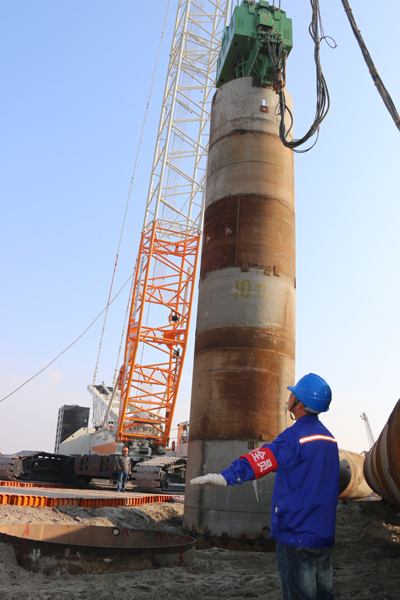 為確保首根樁鋼護筒順利插打到位,工作人員利用雙利千斤頂及時解決了施工中遇到的各種難題,確保了鋼護筒插打順利進行,為下一步鉆孔灌注樁施工的全面展開創造了有利條件。